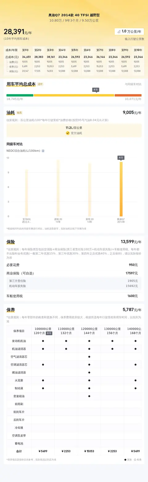 据估算,同级车的最低用车成本是19788元/年,最高是31680元/年,奥迪Q7 2014款 40 TFSI 越野型是27680元/年,用车成本适中,但不占优势。