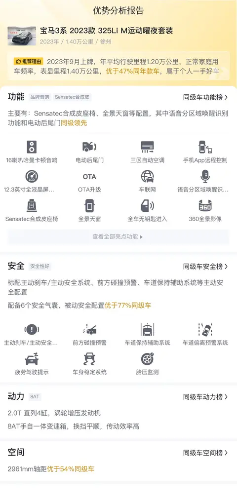 宝马3系(图片|配置|询价)从1975年诞生至今,已经历经了七代车型。每一代3系都以其卓越的操控性能和精致的驾驶体验赢得了全球消费者的喜爱。宝马3系始终坚持运动精神,追求纯粹的驾驶乐趣。它的操控性能在同级别车型中始终处于领先地位,被誉为“驾驶者之车”。今天咱们要看的车,就是宝马3系 2023款 325Li M运动曜夜套装,这款新车在去年9月份上牌,到现在跑了有1.4万公里,新车含税价40.55万,现在二手报价26.8万,可以说是入手好时机。
