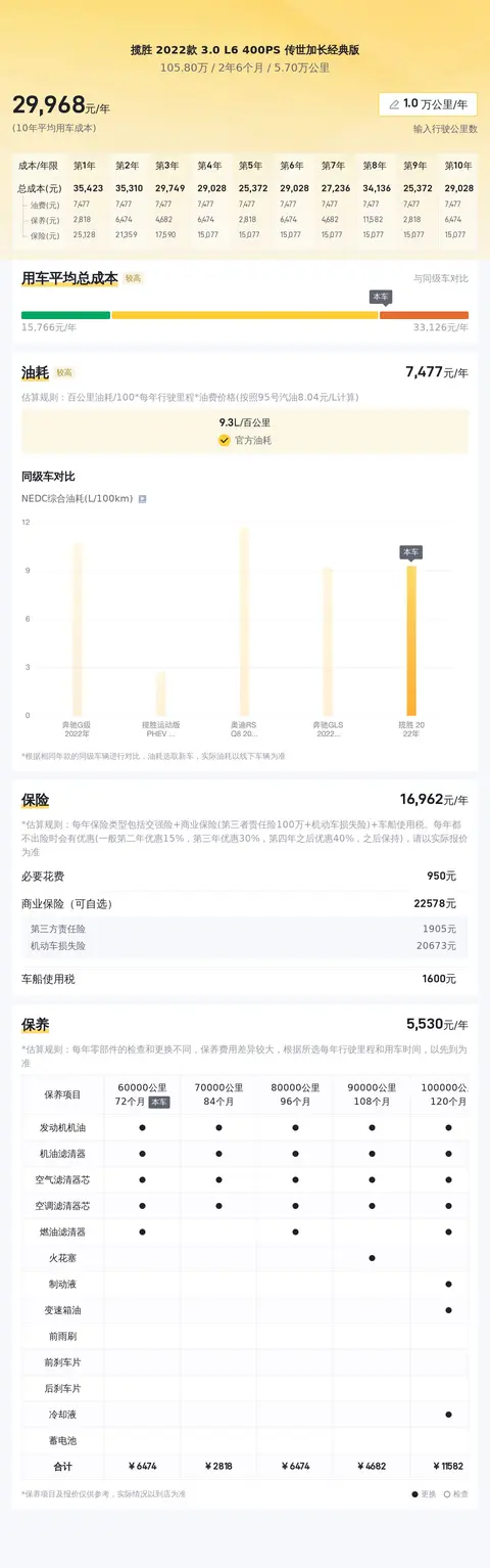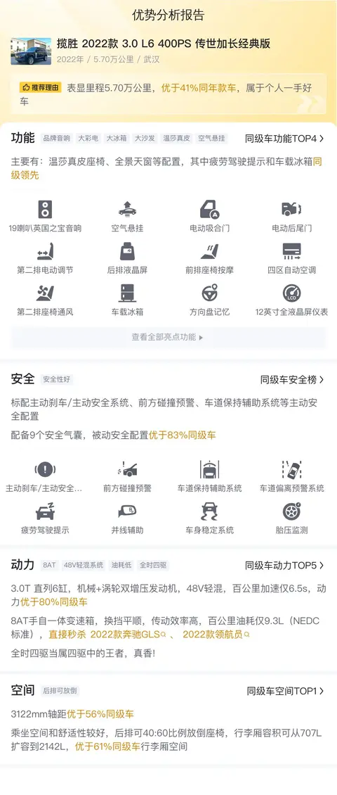 综上所述的新车含税价、用车成本、市场行情、优势分析、同款比价等数据仅供参考。在配置部分,因为二手车非标品,车辆可能会存在配置改装的情况,具体车况信息需要线下结合车辆实际情况进行综合参考。