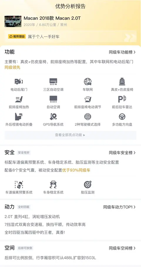 报价远远低于市场行情,Macan 2018款 Macan 2.0T的市场行情价是32.97万-39.81万,它的报价则是26.8万,价格上有很大优势,同时保值率也较高。
