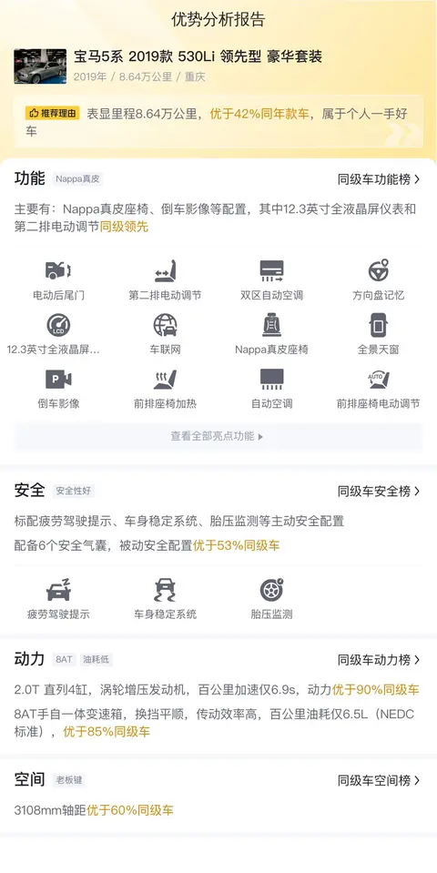 据估算,同级车的最低用车成本是12709元/年,最高是18798元/年,宝马5系 2019款 530Li 领先型 豪华套装是15133元/年,整体适中。