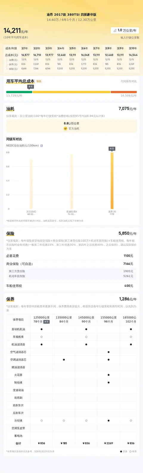 据估算,同级车的最低用车成本是11545元/年,最高是17940元/年,途昂 2017款 380TSI 四驱豪华版是14135元/年,整体不算低,但也不算高。
