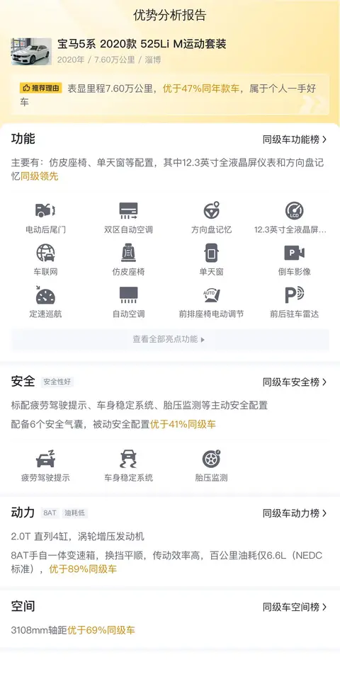 报价远低于市场行情价,宝马5系2020款 525Li M运动套装的市场行情价是23.75万-28.47万,它的报价则是20.78万,价格上有很大优势,同时还是中高配车型,所以性价比很高。