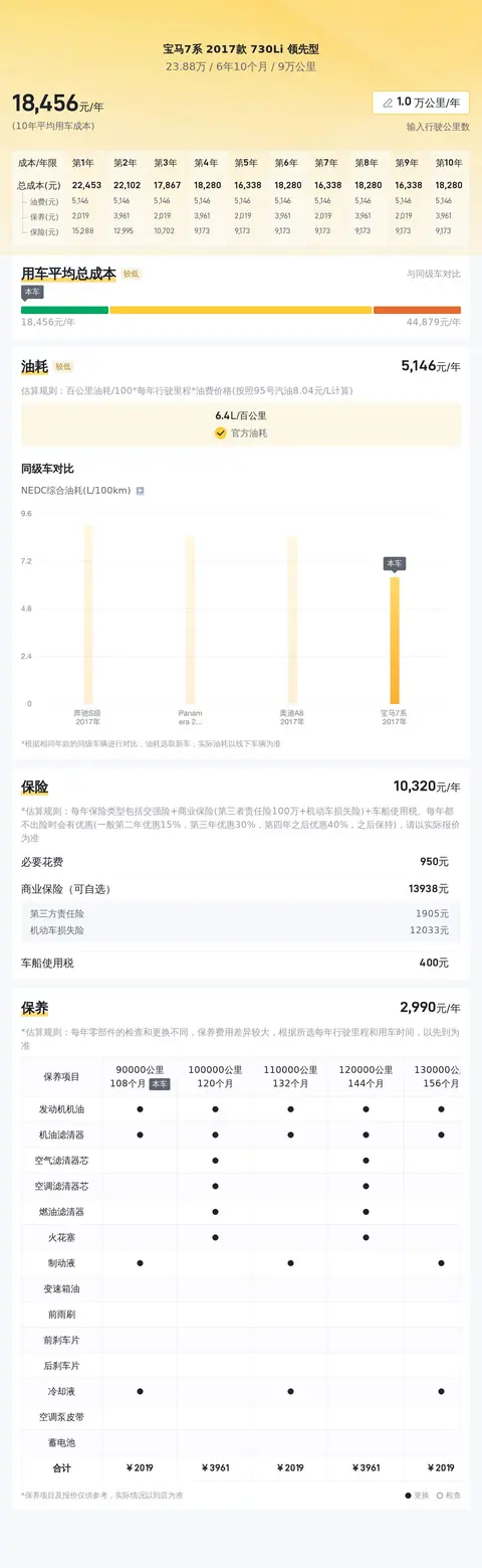据估算,同级车的最低用车成本是18188元/年,最高是41662元/年,宝马7系 2017款 730Li 领先型是18188元/年,所以比较低。