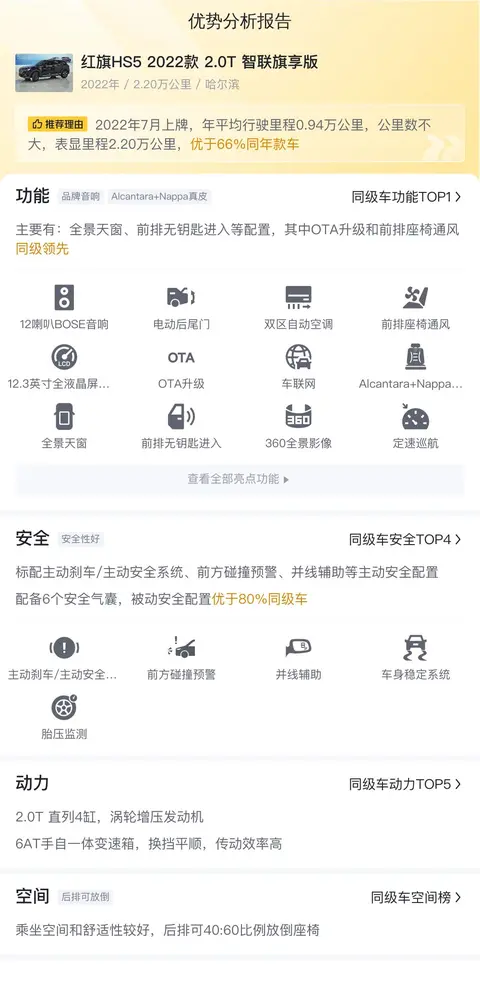 综上所述,这辆二手红旗HS5 2022款 2.0T 智联旗享版无论从配置、性能还是空间来看,都表现的还不错,可以满足大多数家庭的日常出行需求。需要注意的是,本车没有检测报告,车况信息需要线下结合车辆实际情况进行参考。