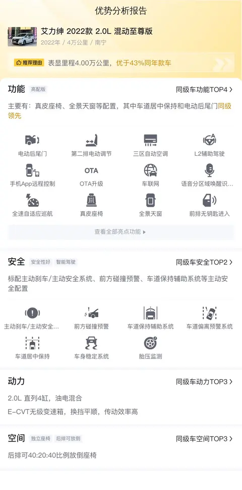 这辆车的优势在于其丰富的配置,如全速自适应巡航和电动后尾门,提供了便利和舒适的驾驶体验。此外,车辆的空间表现也非常出色,适合家庭和商务使用。然而,作为一款混动车型,它的纯电续航里程相对较短,更多依赖于油电混合驱动。