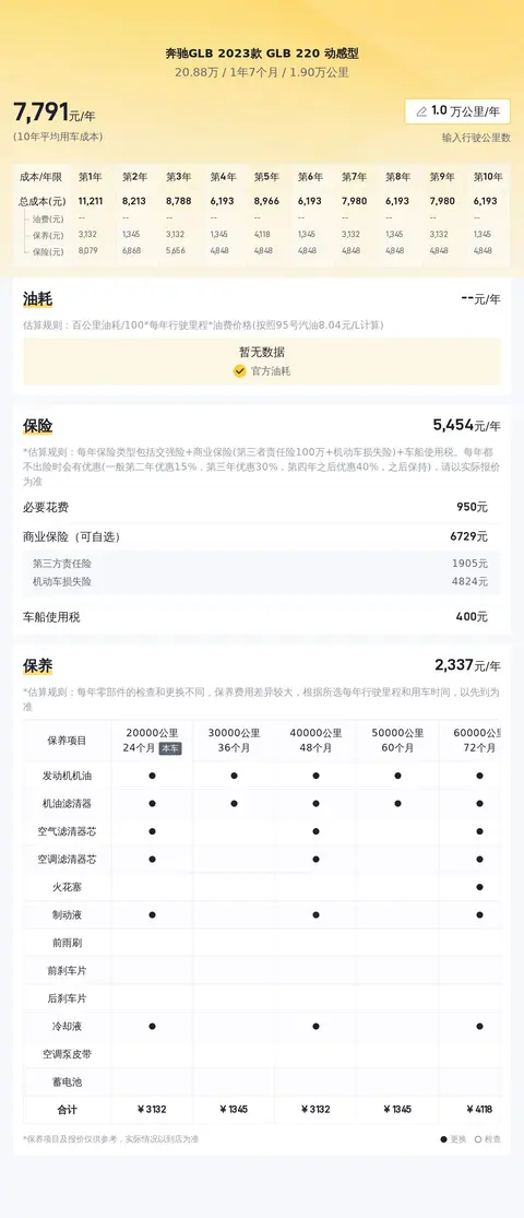 据估算,奔驰GLB 2023款 GLB 220 动感型的平均用车成本是6804元/年,作为豪车品牌,这样的用车成本也属正常。