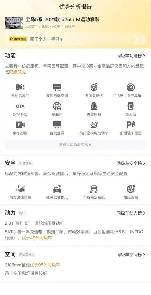 另外,同级车的最低10年平均用车成本是11179元/年,最高是20020元/年,宝马5系 2021款 525Li M运动套装是15181元/年,是适中的水准。