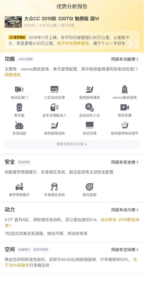 具体到我们推荐的这台车,大众CC 2019款 330TSI 魅颜版 国VI,上牌地为内蒙古鄂尔多斯,2019年11月上牌,表显里程4.5万公里,白色车身深色内饰,0过户,售价12.9万。