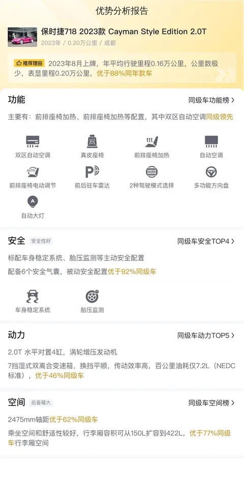 该车具体版本为——2023款保时捷718Cayman Style Edition 2.0T,上牌地车源地均为成都,行驶里程2000公里,上牌时间为2023年8月,新车指导价65万,目前二手车报价55.8万,过户次数为3次。该车的外观颜色为红色,内饰颜色为深色。值得一提的是,虽然该车上牌时间仅1年3个月,但行驶里程却只有2000公里,由此可见该车的使用频率并不高,车辆磨损程度相对较低,可以算是准新车了。