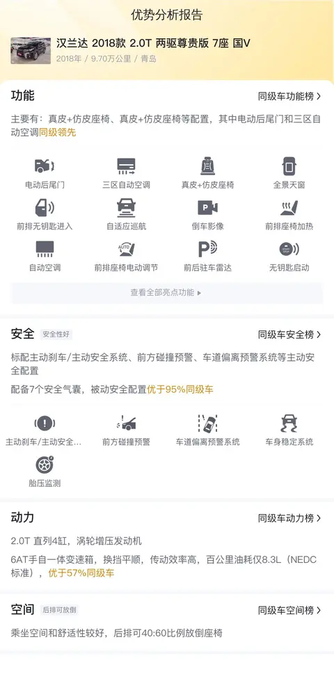 这款汉兰达 2018款 2.0T 两驱尊贵版 7座 国V的上牌日期是2018年8月,表显里程9.70万公里,新车含税价为32.78万,二手车报价是13.98万。它的车源地和上牌地都是青岛,车身颜色是黑色,过户次数3次。