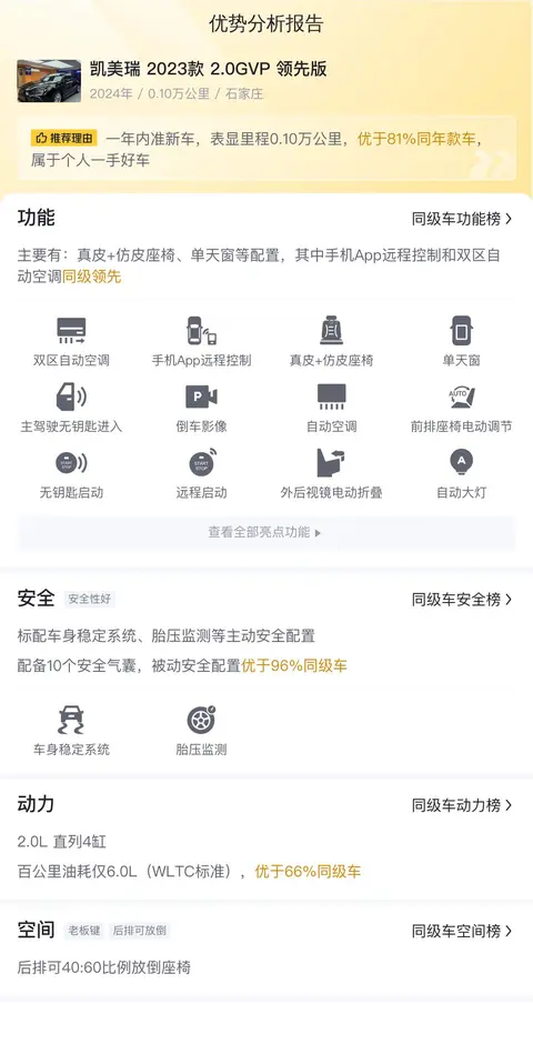 优势:毕竟是2023款的车,所以配置算是比较丰富的,手机APP 远程控制、前方碰撞预警、10个安全气囊等配置,都能体现车的先进性。空间大,舒适性也强。另外,车子行驶里程较少,比较新的车,配置高,保值率也比较不错。