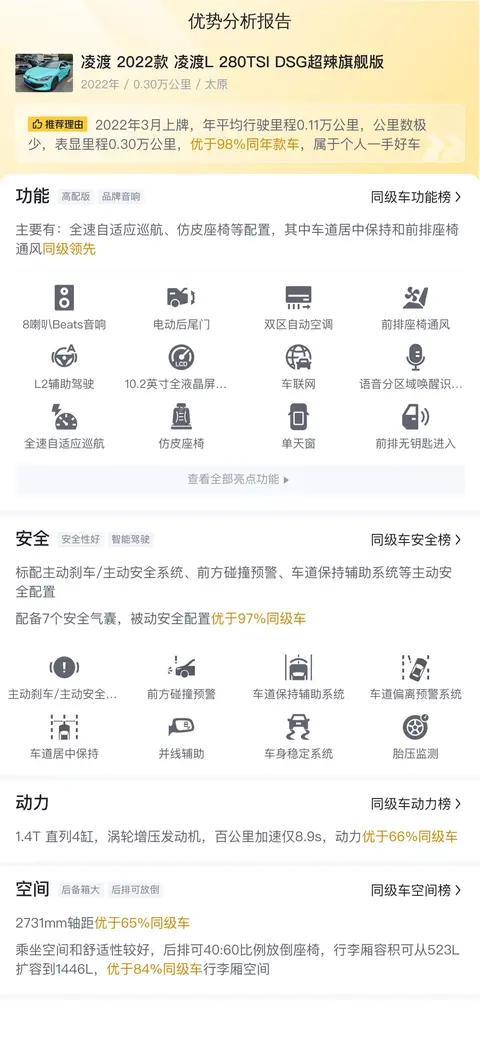 综上所述的新车含税价、用车成本、市场行情、优势分析、同款比价等数据仅供参考。在配置部分,因为二手车非标品,车辆可能会存在配置改装的情况,具体车况信息需要线下结合车辆实际情况进行综合参考。