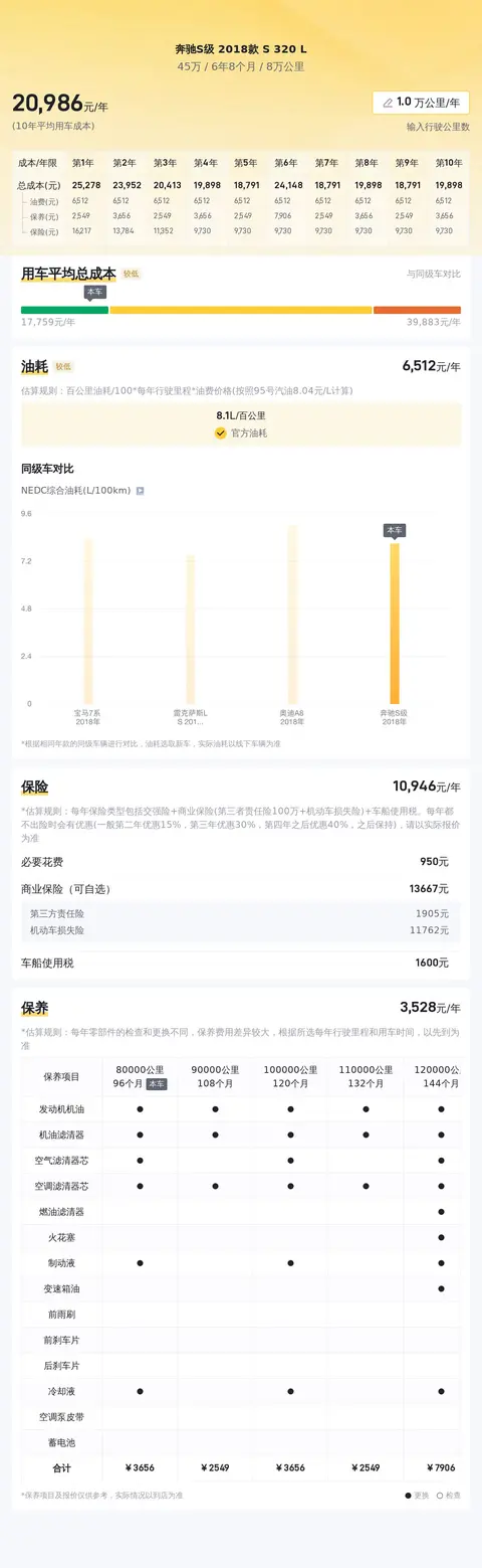用车成本方面,根据懂车帝的大数据分析,这款二手奔驰S级 2018款 S 320 L的10年平均用车成本约为21,578元/年。这一数字相较于同级别车型来说,处于较高区间。这主要是因为这款车搭载了3.0T V6双涡轮增压发动机,油耗相对较高。不过,对于追求极致驾驶体验和豪华感的消费者来说,这一成本还是可以接受的。