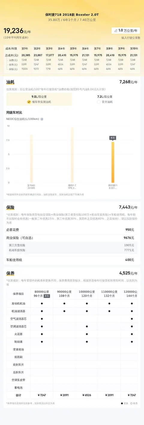 据估算,这辆保时捷718 2018款 Boxster 2.0T的用车成本是18678元/年,同级车最低是18678元/年,最高是41460元/年,所以用车成本偏低。