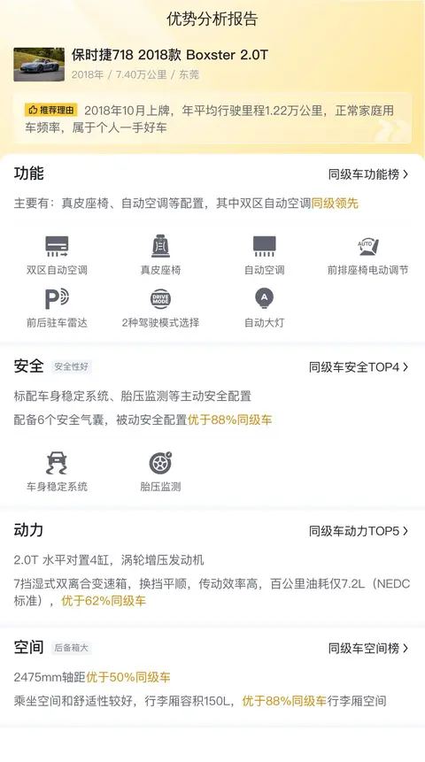 买二手车,配置信息也很重要,这辆保时捷718 2018款 Boxster 2.0T配备了真皮座椅、前后驻车雷达等,其中双区自动空调同级领先。在安全配置上,标配车身稳定系统、胎压监测等主动安全配置,配备7个安全气囊,被动安全配置优于96%同级车。