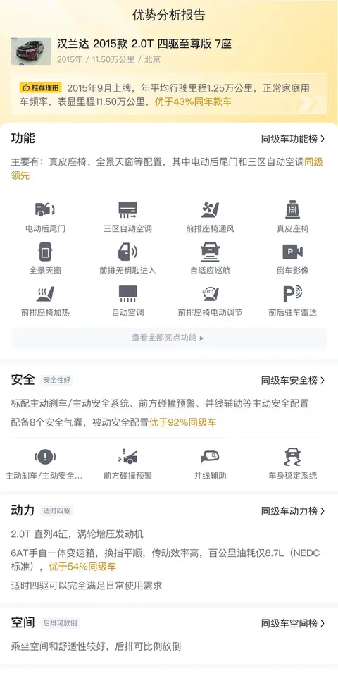 个人认为,买二手车是实用为主,配置够用就可以,毕竟价格在这摆着呢。这辆汉兰达配置还是可以的,个人感觉比较好的有:真皮座椅、全景天窗、前排座椅通风加热、方向盘加热、电动后尾门、定速巡航、前后雷达、倒车影像、自动驻车、上坡辅助、自适应远近光、外后视镜电动折叠加热、内后视镜防眩目、车载冰箱等。其中的一些配置,比如方向盘加热、外后视镜加热,冬天用车的时候你会感觉到非常的舒服。