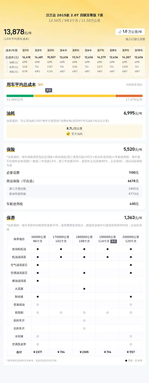 汉兰达2015款2.0T四驱至尊版7座的10年平均用车成本为13649元/年,同级车最低为11448元/年,最高为16371元/年,所以本车用车成本适中。