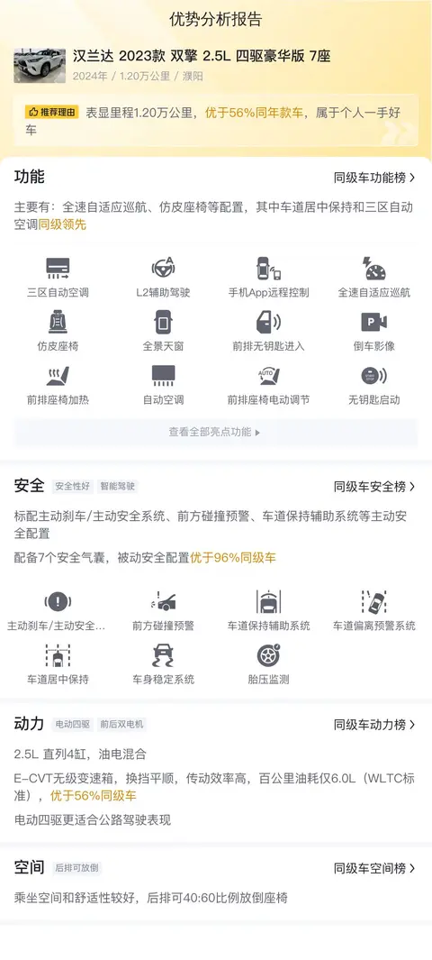 这辆汉兰达在动力性能、配置丰富度、空间舒适性和市场保值率等方面展现出明显优势。尤其是其双擎动力系统,在保证充足动力的同时,还能有效降低油耗,非常符合注重经济性的消费者需求。另外,车辆外观大气,内部空间宽敞,无论是家庭出行还是商务接待,都能提供舒适的乘坐体验。然而,需要注意的是,由于未见到具体的车辆检测报告,潜在买家在决定购买之前,建议自行对车辆进行全面的检查,特别是要关注车辆是否有过重大维修或事故记录,以及车辆的实际状况是否与卖家的描述相符。