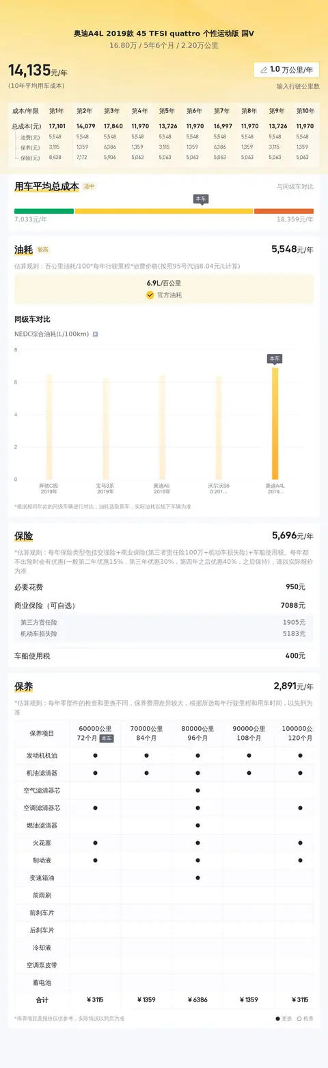 经过对大量车主的用养车费用进行统计和分析,得出这辆车的养车成本适中。年度用车成本大约在14598元左右,具体费用(按每年 2 万公里计算)为年燃油费用约11111元,年保养费用约3888元,年保险费用约5000元。养车成本与同价位二手车相比差别不大,用车经济性还是不错的。