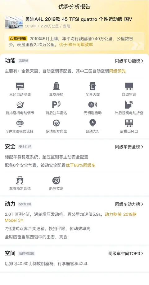 在豪华B级车市场中,奥迪A4L 2019款 45 TFSI quattro 个性运动版 国V具有一定的竞争力。首先,其搭载的2.0T直列4缸涡轮增压发动机提供了强劲的动力输出,百公里加速仅5.9秒,远超2019款特斯拉Model 3。其次,7挡湿式双离合变速箱换挡平顺,传动效率高,优于80%同级车。此外,全时四驱系统为车辆提供了更好的操控性和稳定性。在配置方面,这辆车配备了真皮座椅、全景天窗等豪华配置,并拥有三区自动空调这一同级领先装备。车内空间宽敞,后排座椅可40:60比例放倒,行李厢容积达424L,满足日常使用需求。然而,在面对一些直接竞争对手时,如奔驰C级、宝马3系等车型,奥迪A4L在品牌影响力、科技感等方面可能稍逊一筹。同时,其内饰材质和隔音效果也仍有提升空间。总体而言,奥迪A4L 2019款 45 TFSI quattro 个性运动版 国V凭借其出色的动力表现、豪华配置和宽敞空间,在豪华B级车市场中占据了一席之地。尽管存在一些不足之处,但其综合性能仍然值得消费者考虑。