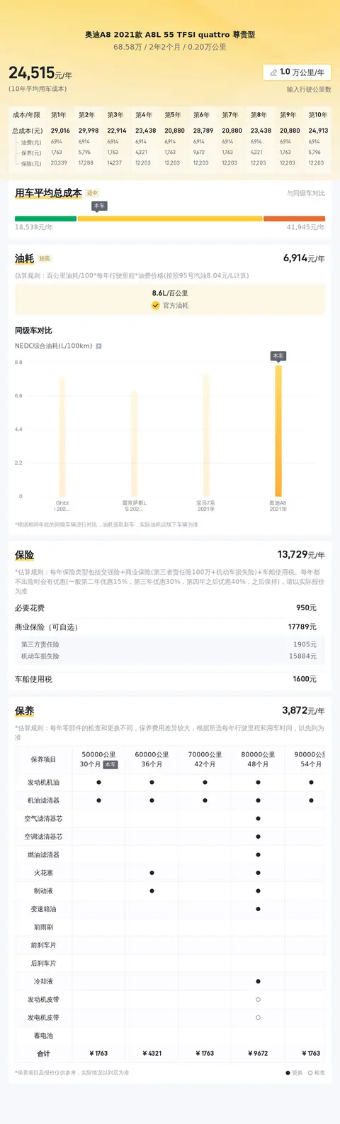 据估算,奥迪A8 2021款 A8L 55 TFSI quattro 尊贵型的用车成本较低,因为同级车的最低用车成本是21702元/年,最高是45221元/年,而奥迪A8 2021款 A8L 55 TFSI quattro 尊贵型是24683元/年,所以较低。