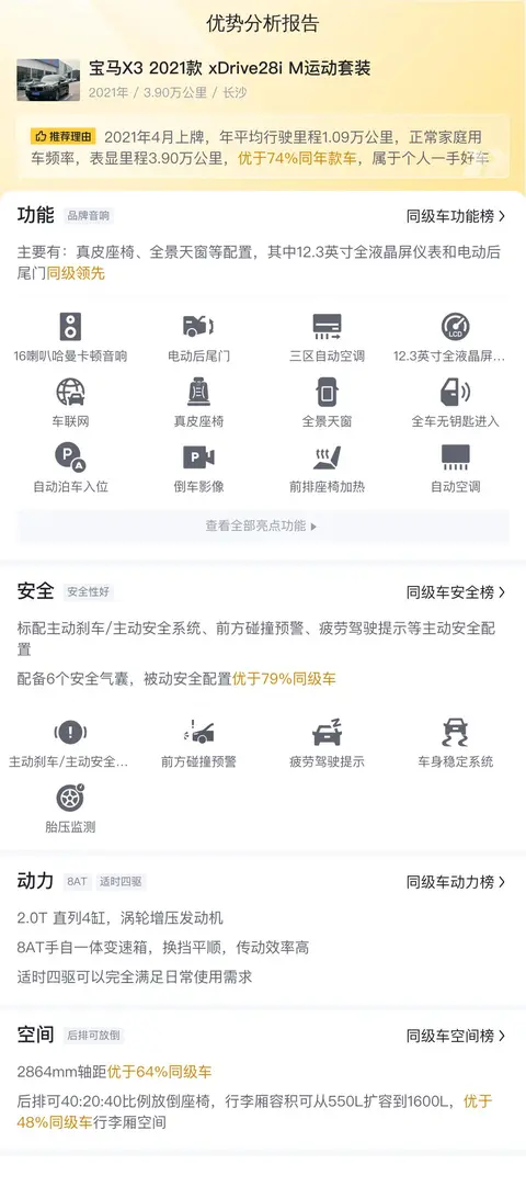 今天,小编跟大家分享的这款2021款宝马X3 xDrive28i M运动套装是一辆二手车源。该车首次上牌时间为2021年4月,至今行驶里程仅为3.9万公里。车源地和上牌地均为长沙,车身颜色为黑色,目前无过户记录。由于宝马X3在全国中型SUV销量榜中排名第四,并且是最近一年销量最好的宝马X3车型,因此这款二手车的热度相当高。更重要的是,这款车目前的售价仅为22.28万元,相较于其42.58万元的新车指导价,几乎便宜了一半,性价比极高。
