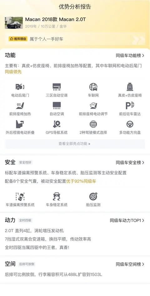 在竞争激烈的市场中,每一款车型都需要有其独特的优势才能脱颖而出。对于这辆Macan 2018款 Macan 2.0T来说,它的主要卖点在于其品牌影响力、驾驶体验以及豪华配置。然而,与同级别车型相比,它在某些方面也存在一定的劣势。例如,它的储物空间设计可能不够人性化,油耗相对较高,以及后排空间可能不够宽敞等问题,都是消费者在购买时需要权衡的因素。尽管如此,这辆Macan仍然以其卓越的驾驶性能、豪华的内饰配置以及保时捷品牌的强大影响力,吸引着众多消费者的关注。对于那些追求驾驶乐趣、注重车辆品质和品牌形象的消费者来说,它仍然是一款值得考虑的车型。