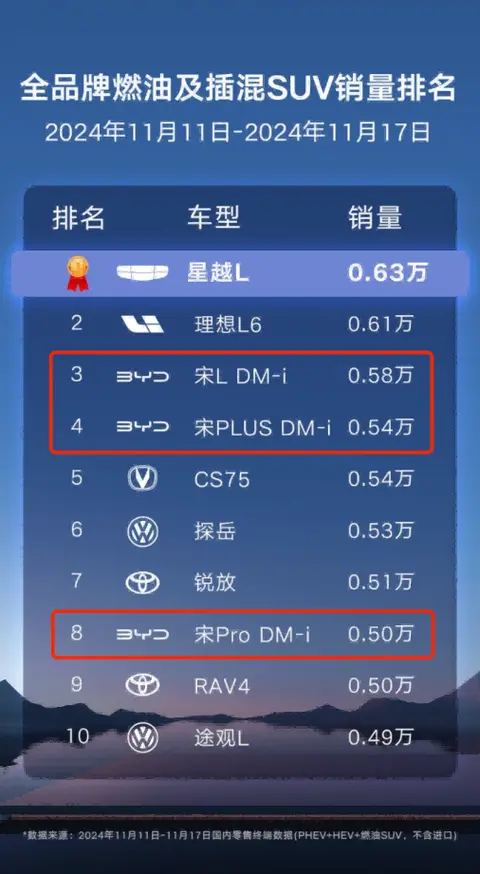 在刚刚过去的一周,星越L(图片|配置|询价)取得了全品牌燃油及插混SUV销量排名第一的好成绩,不仅继续力压如锐放、荣放等热门合资SUV,更是再次领先比亚迪宋三款插混SUV,实力不容小觑。