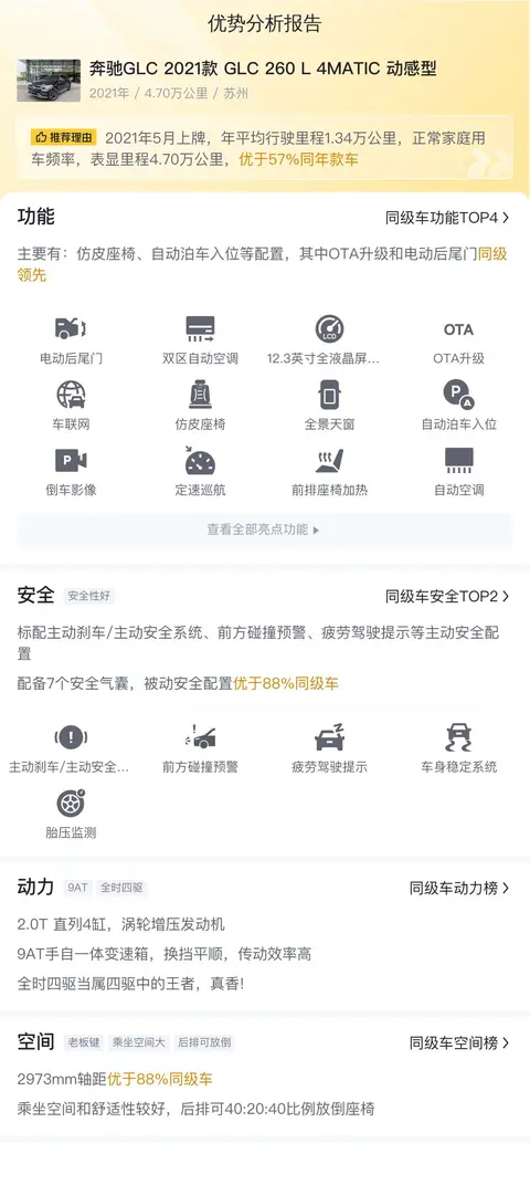 综上所述,这辆二手奔驰GLC 2021款 GLC 260 L 4MATIC 动感型在车况、配置、性能、安全和舒适性等方面都表现出色。如果您正在寻找一款性价比高、品质可靠的豪华SUV,那么这辆车绝对是一个不错的选择。不过,在购买二手车时,请务必确保您对车辆的状况有足够的了解,并选择信誉良好的卖家进行交易。祝您购车愉快!