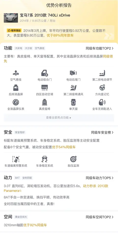 综上所述的新车含税价、用车成本、市场行情、优势分析、同款比价等数据仅供参考。在配置部分,因为二手车非标品,车辆可能会存在配置改装的情况,具体车况信息需要线下结合车辆实际情况进行综合参考。