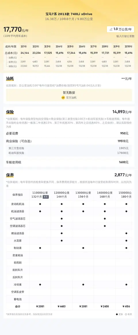 买车容易养车难,接下来我们就来看看这款宝马7系740Li的使用成本如何。十年平均车损金额为116,380元,十年平均用车成本为30,880元/年。