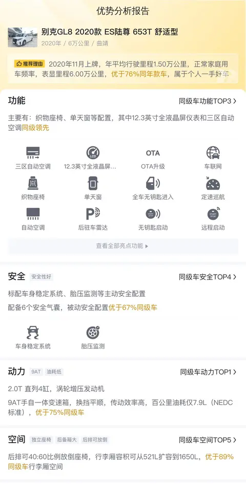 缺点:价格属于虚高,毕竟这辆二手别克GL8 2020款 ES陆尊 653T 舒适型报价22.38万,相当于开了4年左右便宜了10.41万,还不如直接买新车。而且别克GL8 2020款 ES陆尊 653T 舒适型的市场行情价是19.28万-23.04万,它的报价是22.38万,价格上不占什么优势。此外,同级车的最低用车成本是13952元/年,最高是16378元/年,而它的是15243元/年,用车成本也较高。