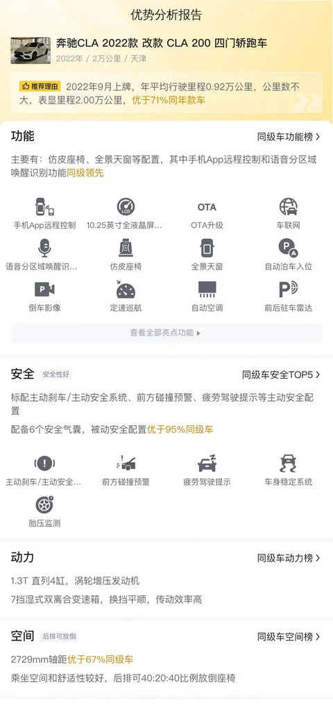 整车的配置还是很丰富的,这款奔驰CLA 2022款 改款 CLA 200 四门轿跑车配备了全景天窗、OTA升级、前排座椅电动调节、双区自动空调等配置。安全配置上,标配主动刹车/主动安全系统、前方碰撞预警、疲劳驾驶提示等主动安全配置,配备8个安全气囊,被动安全配置优于96%同级车。