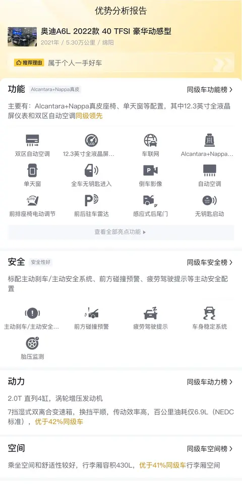综上所述,这辆二手奥迪A6L 2022款 40 TFSI豪华动感型不仅提供了卓越的驾驶体验,还兼顾了舒适性和科技感。它的油耗表现、座椅材质、屏幕尺寸以及乘坐空间都在同级别车型中名列前茅,展现了奥迪品牌在豪华中大型轿车领域的强大竞争力。无论是日常通勤还是商务出行,这辆奥迪A6L都能满足您对高品质生活的追求。如果您正在寻找一辆性能卓越、舒适优雅的豪华轿车,那么这辆二手奥迪A6L无疑是一个值得考虑的选择。