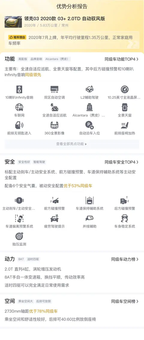 综合以上信息,这辆领克03 2020款 03+ 2.0TD 自动驭风版在动力、内饰和配置方面都有着不错的表现,适合那些追求驾驶乐趣和高品质生活的消费者。然而,也需要考虑到车辆的后排空间较为局促,以及油耗偏高等问题。总体而言,如果你能接受这些小缺点,并且对这辆车的动力和内饰配置情有独钟的话,那么它或许确实是一个不错的选择。