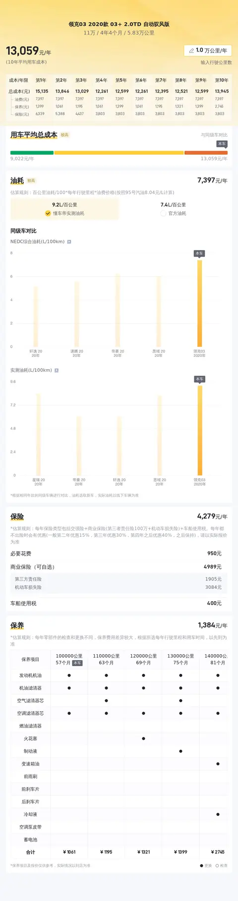 据估算,领克03 2020款 03+ 2.0TD 自动驭风版的用车成本适中,因为它的用车成本是13156元/年,同级车最低是10427元/年,最高是14349元/年。