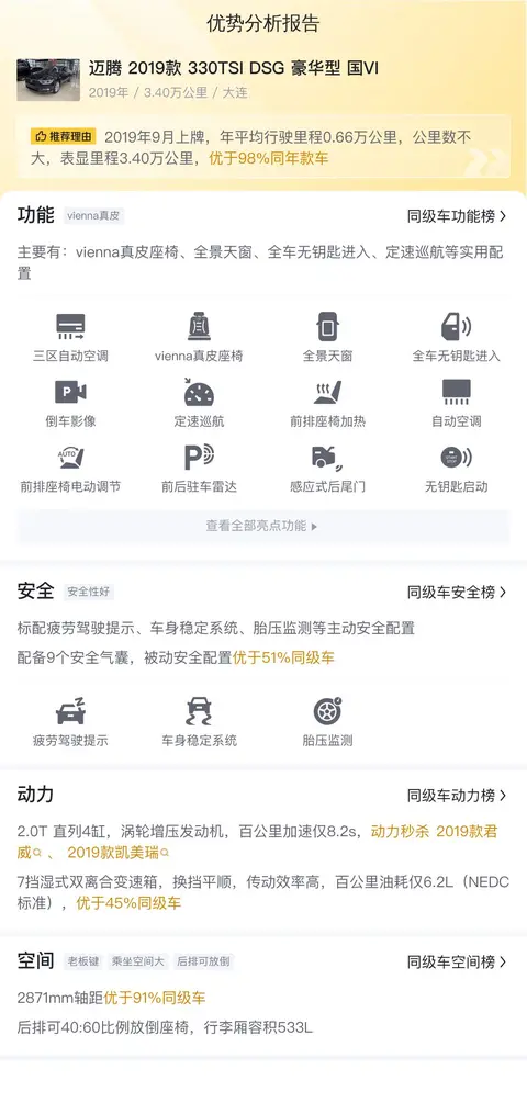 二手车的配置也很重要,这辆迈腾 2019款 330TSI DSG 豪华型 国VI配备了三区自动空调、全车无钥匙进入和启动、定速巡航、前排座椅加热、单色车内氛围灯等配置。安全配置上,标配疲劳驾驶提示、车身稳定系统、胎压监测等主动安全配置,配备9个安全气囊,被动安全配置优于96%同级车。