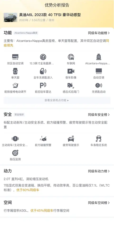 根据懂车帝给出的大数据分析,奥迪A6L 2023款 40 TFSI豪华动感型的二手车报价在25.23-29.84万之间,考虑到这辆车的车龄小、里程短、外观新、配置全等因素,它的性价比是非常高的。按照每年行驶2万公里计算,每年的油费大约为11463元,保养费用大约为4330元,保险费用大约为5631元,总体来说,养车成本还是比较合理的。