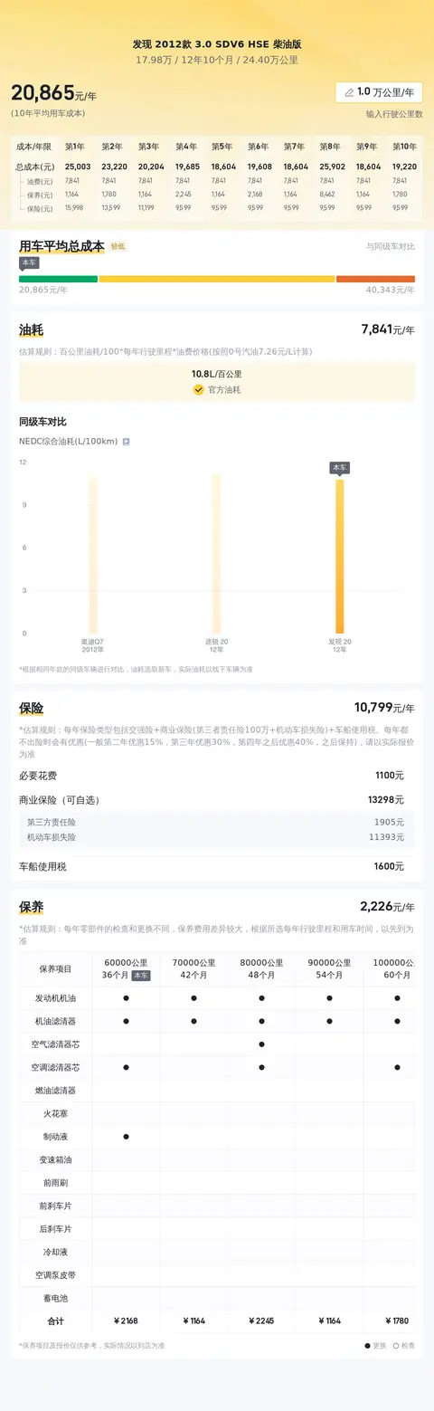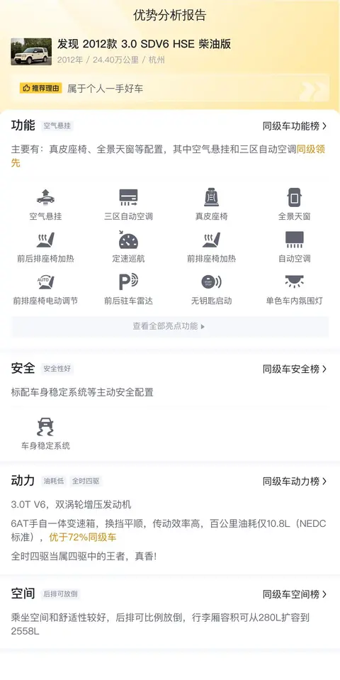 综上所述,这款2012款路虎发现3.0 SDV6 HSE柴油版在动力性能、车身尺寸、座椅舒适性、配置亮点等方面均表现出色。然而,作为一款已经行驶了24万公里且没有检测报告的二手车,潜在买家在做出购买决策之前应特别关注车辆的保养状况、里程数和潜在的维修成本等因素。通过仔细评估和对比市场上的类似车型,买家有望以合理的价格购入这款豪华中型SUV,从而满足自己在日常出行和长途旅行中的舒适性和实用性需求。