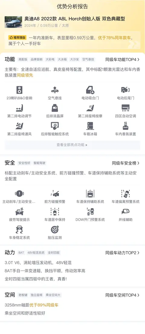 综上所述,奥迪A8 2022款 A8L Horch创始人版 双色典藏型在豪华大型轿车市场中是一款备受瞩目的车型,它凭借出色的品质、豪华的配置和合理的价格赢得了消费者的青睐。然而,市场竞争激烈,特别是来自奔驰S级、宝马7系等竞争对手的压力,奥迪A8需要不断提升产品竞争力以保持市场优势。对于潜在买家而言,奥迪A8 2022款 A8L Horch创始人版 双色典藏型是一款集豪华、科技与性能于一体的旗舰级轿车,可以考虑选择。但同时也要考虑到维护和保养成本相对较高,需要长期投入较多资金。尽管如此,奥迪A8 2022款 A8L Horch创始人版 双色典藏型依然凭借其出色的品质、豪华的配置和合理的价格在市场上保持着较强的竞争力。该车没有检测报告,建议您在购买前务必亲自查看车辆实际情况,确保满意再行购买。