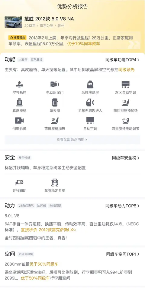 另外,同级车的最低10年平均用车成本是13178元/年,最高是37720元/年,揽胜 2012款 5.0 V8 NA是35058元/年,是比较高,但这类车,买的就是享受。