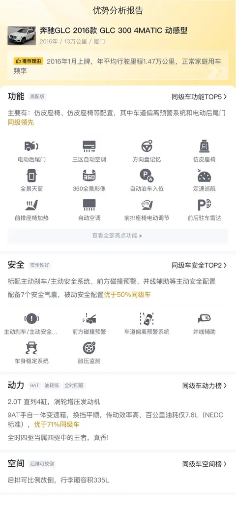缺点:价格虚高,奔驰GLC 2016款 GLC 300 4MATIC 动感型的市场行情价是12.20万-15.39万,13.98万的报价确实不低了。而且作为老车,奔驰GLC 2016款 GLC 300 4MATIC 动感型已经行驶了13万公里了,也加大了后期的养护成本。同时豪车到了一定年限使用和维修成本较高,需慎重考虑。