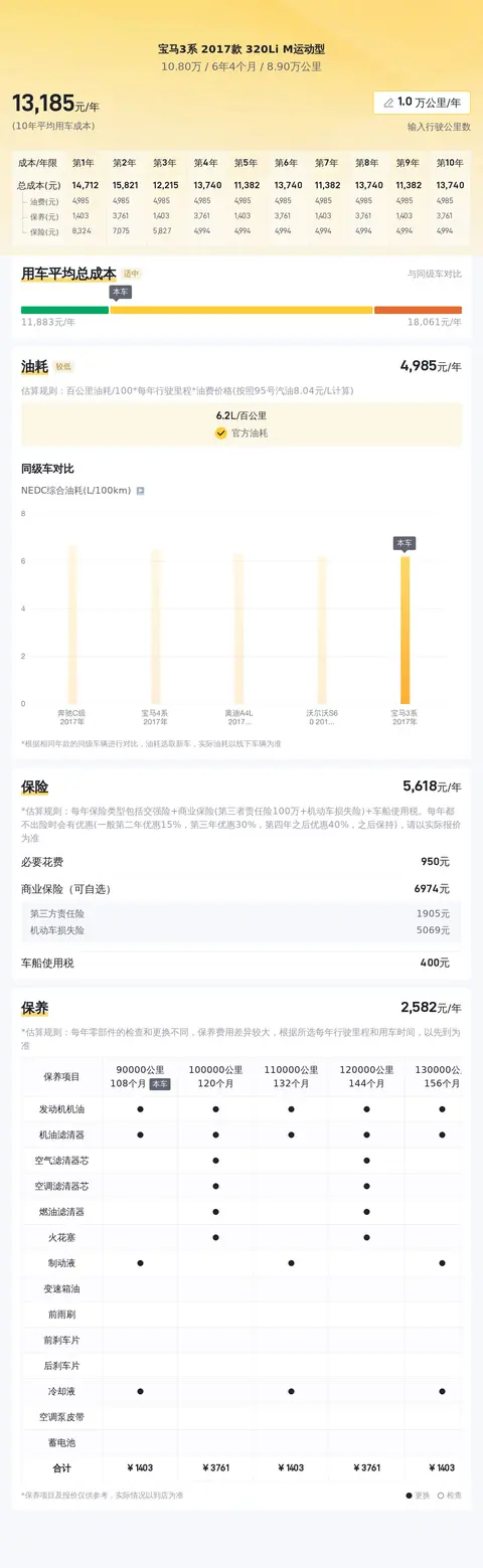 当前市场上,这款2017款宝马3系320Li M运动型的二手车价格区间大致在13万至16万之间。然而,本文介绍的这辆特定车辆,其售价仅为10.8万元,这一价格明显低于市场平均水平,显示出极高的性价比。在用车成本方面,根据相关数据显示,这辆宝马3系的年均综合用车成本约为1.3万元。这一数字与同级别车型相比,处于合理范围内,显示出这款车型在日常使用中的经济性表现良好。