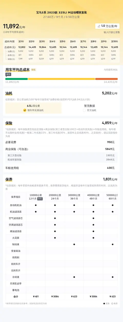 在选择一辆车时,除了看中它的性能、外观或者舒适度之外,还有一个重要的考量因素那就是用车成本。不同车型的用车成本是有差异的,即使排除油价波动这一不可控因素,也会有保险和保养费用的不同。今天,我们要聚焦的是2023款宝马3系325Li M运动曜夜套装这款车,它在同级别车型中的用车成本表现如何呢?是偏低、偏高还是刚好适中呢?让我们用数据来说话。
