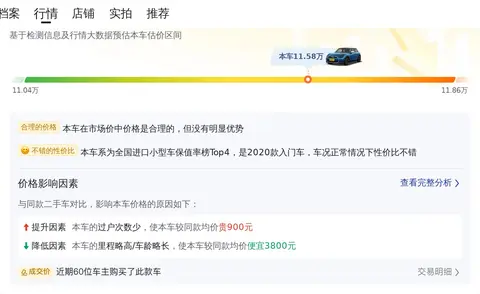 接下来,咱们来聊聊这辆车的二手行情。目前,这款小宝贝的二手车行情大致在9.66万至11.74万之间。咱们今天说的这辆二手MINI报价11.58万,虽然价格偏高,但是考虑到它那可爱的模样和出色的性能,还是挺有市场的。不过,也得注意,啊,这辆车比一般的二手车贵一些,所以在买之前一定要仔细看看车况,别到时候买了个“惊喜”变“惊吓”。