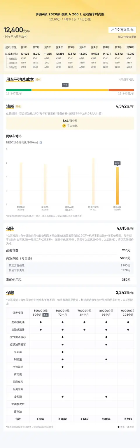 用车成本方面,根据懂车帝对奔驰A级 2020款 改款 A 200 L 运动轿车时尚型的分析,其年均综合用车成本大概在每年1.2万元左右,实际费用开销会根据车主不同的使用习惯而有所改变。