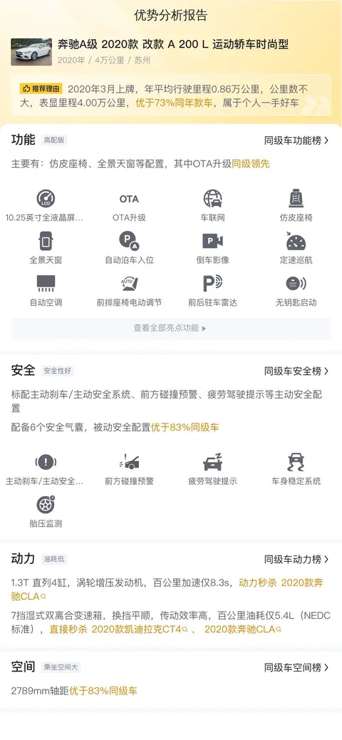 车型级别:奔驰A级 2020款 改款 A 200 L 运动轿车时尚型