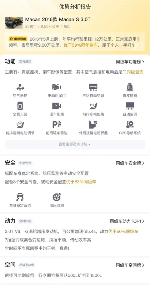 优势方面,这辆Macan搭载的3.0T V6,双涡轮增压发动机,百公里加速仅5.4s,动力优于50%同级车,7挡湿式双离合变速箱,换挡平顺,传动效率高,全时四驱当属四驱中的王者,真香!