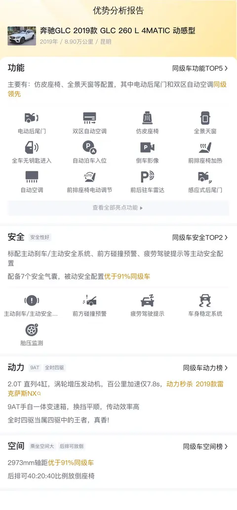 缺点则是奔驰GLC 2019款 GLC 260 L 4MATIC 动感型的二手行情价在18.91万-26.07万,它的报价是19.98万,报价虽然合理,但优势不明显。而且最近几年奔驰不断暴露出一些质量问题,可能会在后期的使用过程中出现。